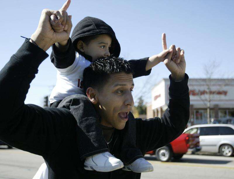 Jose Montoya of Elgin holds Xavier Sanchez, 3, of Elgin, on his shoulders during a Saturday march to protest gang violence in honor of Eric Galarza Jr. who was recently killed. More than 100 people marched with signs and shirts protesting the violence. Steve Berczynski/sberczynski@dailyherald.com