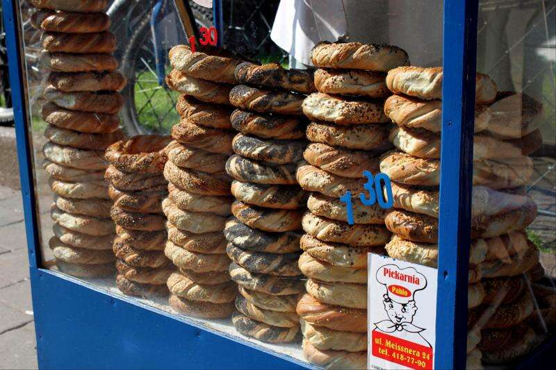 Cheapest and most popular for a snack are the blue carts that sell rings of fresh-baked bread dough covered in poppy seeds, cheese or sesame seeds. Bakeries every few streets sell pastries filled with chocolate, apples, strawberries and cheese, huge loaves of bread and small Polish cookies.