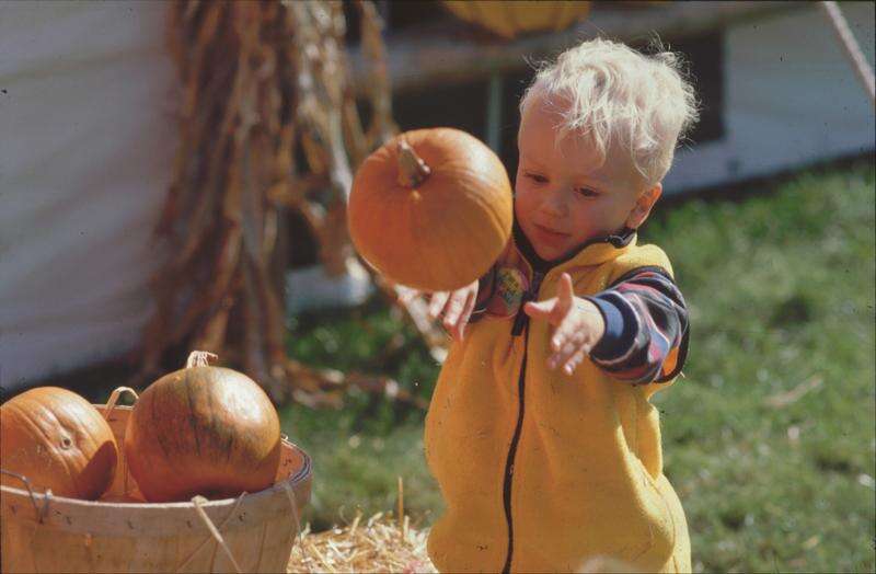 A youngster plays with a pumpkin in the ChildrenÂ’s Garden at the Morton Arboretum. Courtesy of The Morton Arboretum