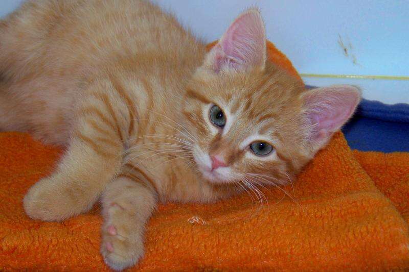 The loss of sensation would mean Wrigley would need special medications to use the litter box. He is taking Miralax and Cisipride orally and must eat a high-fiber food. This little guy is now 4-5 months old and doing well. This little red tabby rewarded all the volunteers with a show of his own. He has learned to run laps around a bank of cat condos. He is not bothered by the loss of a tail; at least it does not slow him down. Since he received so much attention since arriving at the shelter he has loads of personality.