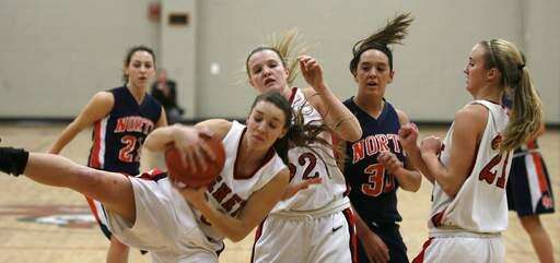 Benet's Eden Olson, left, battles Bartlett's Ashley Johnson, right, during girls basketball at the 2011 Tip-Off Tournament in Lisle. Daniel White | Staff Photographer