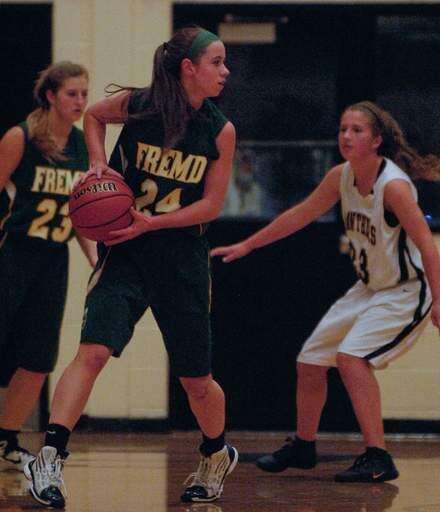 Fremd's Jessi Wiedemann looks to pass past Fenwick's Meredith Boardman in the first quarter of the third place game in Dundee-Crown's holiday tournament on Thursday, December 29.