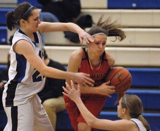 Daniel White/dwhite@dailyherald.com Geneva High School's Morgan Seberger (22), and Ashley Santos (33), moves through the DeKalb High School defense during the Benet/Naperville North girls´ basketball Holiday Tournament, Friday.