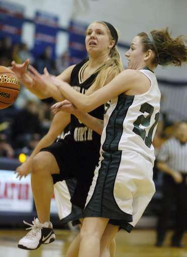 Grayslake North's Jordyn Bowen, left, fouls Grayslake Central's Savannah Mudd.