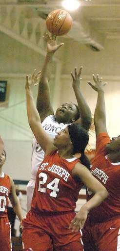Donna Koerber,left, of St. Joseph and Kateri Stone of Montini go a for a rebound.