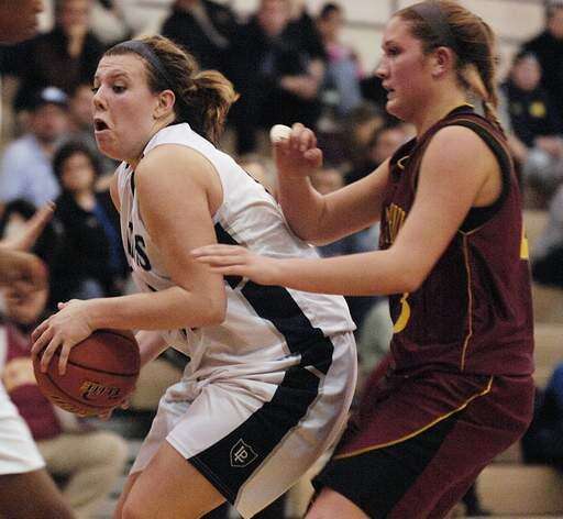 Bartlett's Lisa Palmer, left, takes a shot underneath the basket as Schaumburg's Vicki Frullani defends during Wednesday's game at Schaumburg. JOE LEWNARD | Staff Photographer