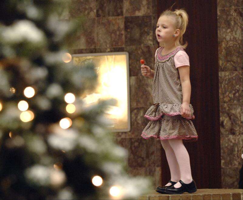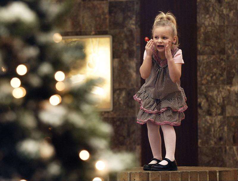 Madison Meikel, 5, of Rolling Meadows yells to Santa through the Christmas trees when he arrives Thursday at Woodfield Shopping Center in Schaumburg. Bill Zars/bzars@dailyherald.com