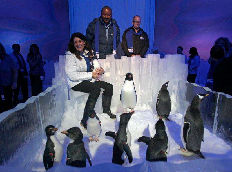 SeaWorld Orlando executives, from back left, Julie Scardina, animal ambassador, Terry Prather, park president, and Brian Morrow, director of creative development, talk about the new attraction, “Antarctica — Empire of the Penguin” that will be added to the Orlando theme park. Associated Press