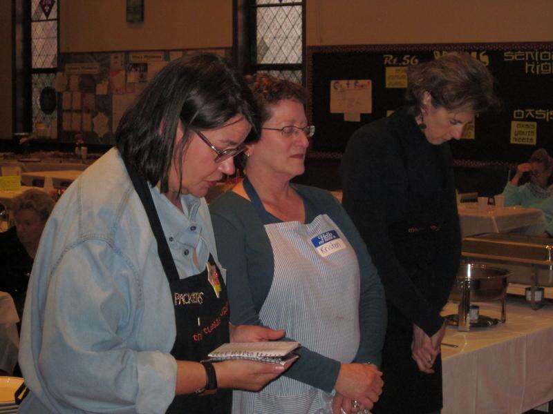 Vicky and Maria Isely of Batavia, members of the church, have missed only one dinner since it started. They are seated with Keith Isaac.