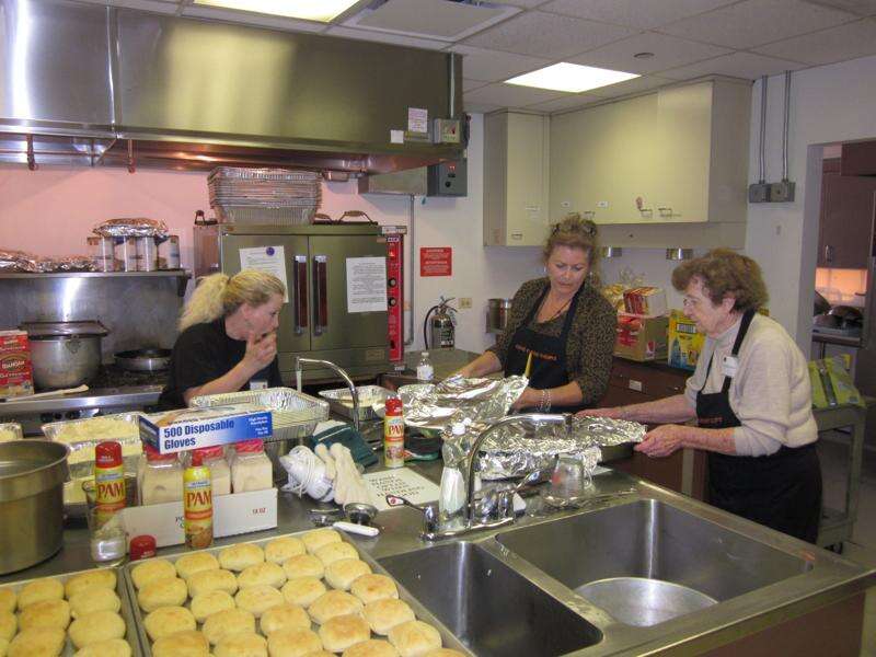 Over in the kitchen, co-chairman Gayle Taylor is cleaning up a turkey-broth spill on the floor, hustling buns in and out of an oven, and directing servers where to go to pick up the hot pans of food.