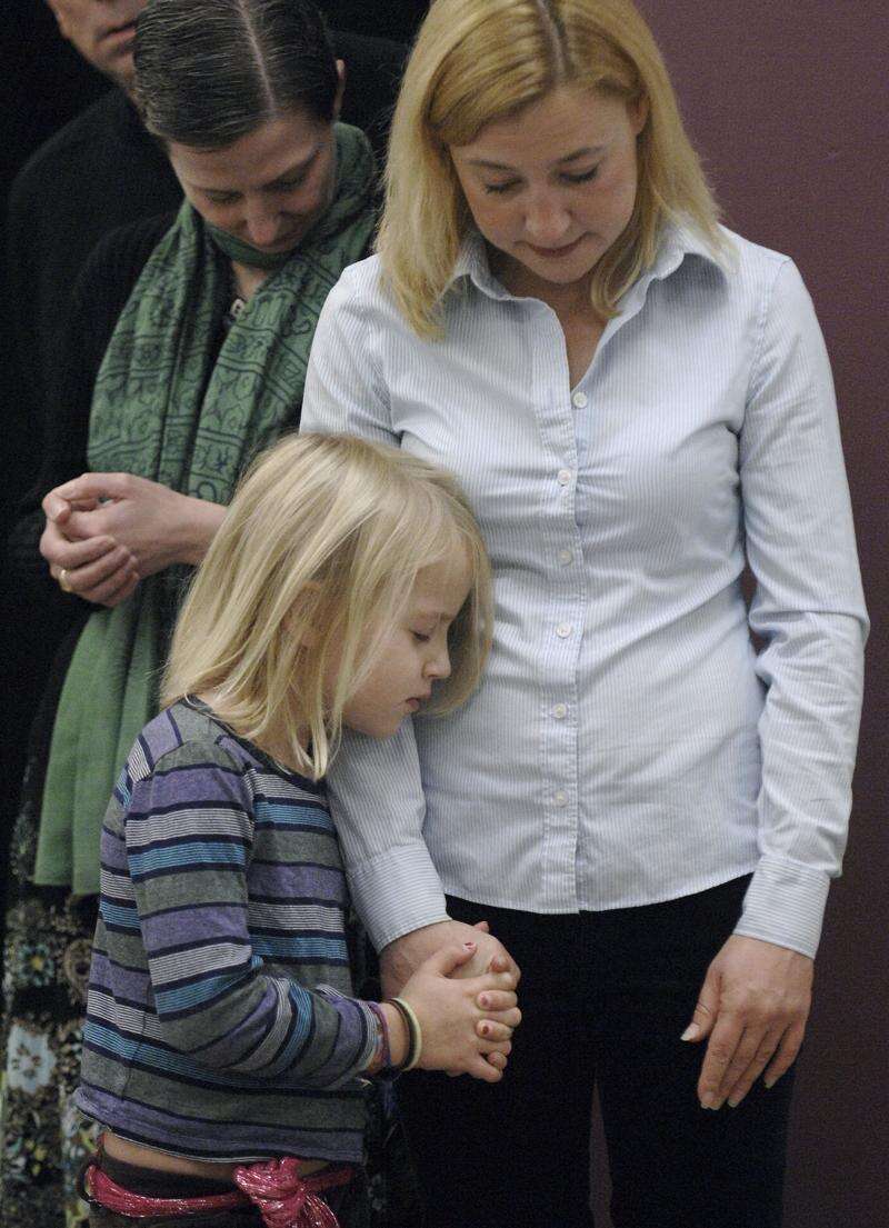 Eleanor Moeller, 6, of Elgin joins in prayer with her mother, Anna, and other volunteers before the start of the Thanksgiving Community Dinner at the Hemmens Cultural Center in Elgin late Thanksgiving morning. This is their first time volunteering at the dinner. Laura Stoecker/lstoecker@dailyherald.com