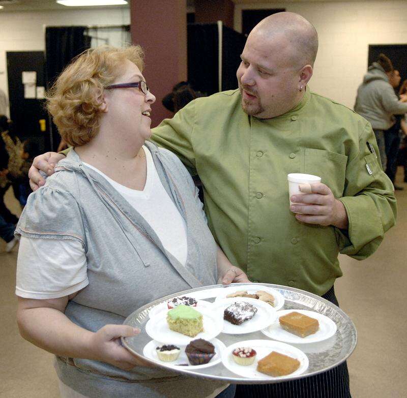 Volunteer Angela Kibbe of Elgin greets Thanksgiving dinner organizer and chef Jeff Turner of In the Neighborhood Deli while serving desserts at The Hemmens late Thursday morning. Kibbe, a new mom, said she was so thankful for her baby that when she saw the ad in a newspaper asking for volunteers for the dinner she knew it was what she wanted to do. Laura Stoecker/lstoecker@dailyherald.com