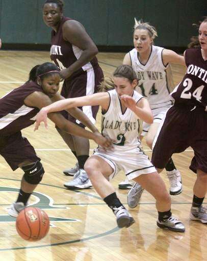 St. Edward's Rena Ranallo, right, and Montini's Nikia Edom, left, scramble for a loose ball.