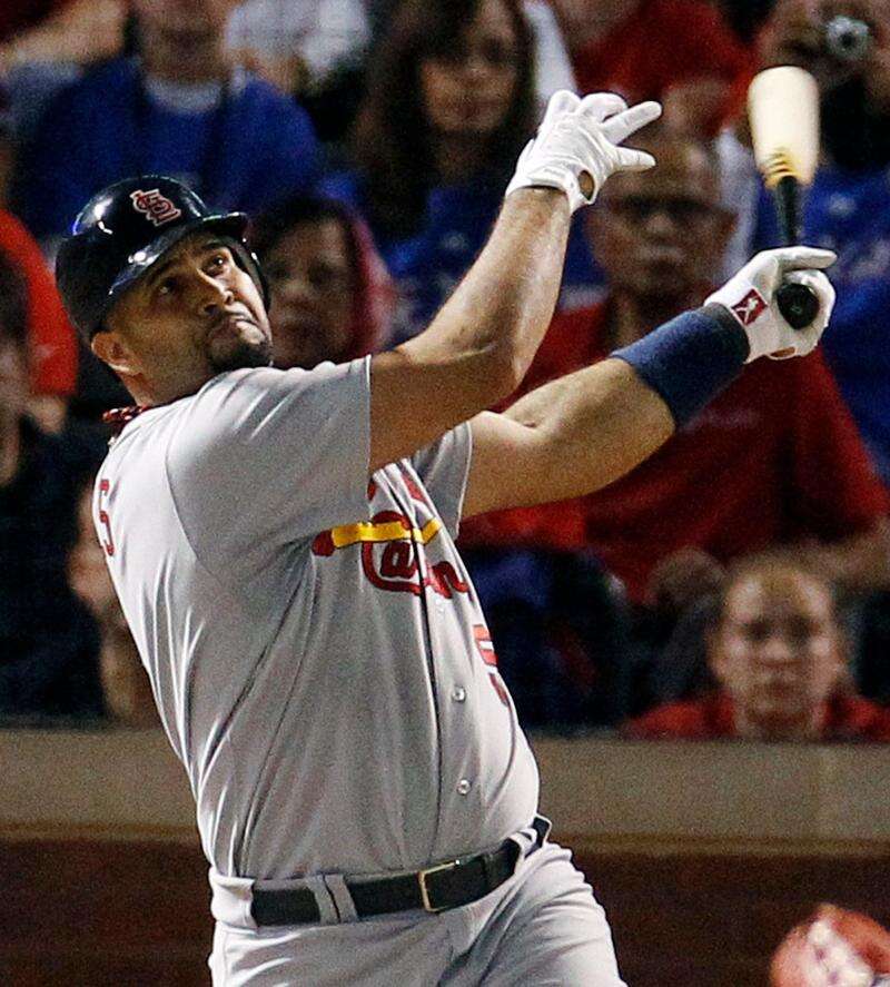 St. Louis Cardinals' Albert Pujols watches his three-run home run against the Texas Rangers during the sixth inning of Game 3 of baseball's World Series Saturday, Oct. 22, 2011, in Arlington, Texas. (AP Photo/Eric Gay)
