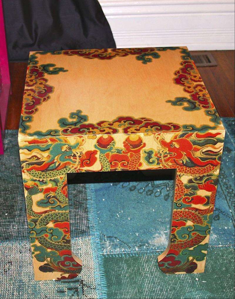 Red Egg caused a stir at market, winning best showroom design and grabbing lots of attention for its Tattoo Table. A digital photograph of the painted ceiling of a Tibetan monastery was printed onto the varnished maple plywood surface, resulting in “Faithful Sidekick.” The side table comes in solid lacquer colors and has flat carved Chinese horseshoe feet to add detail.