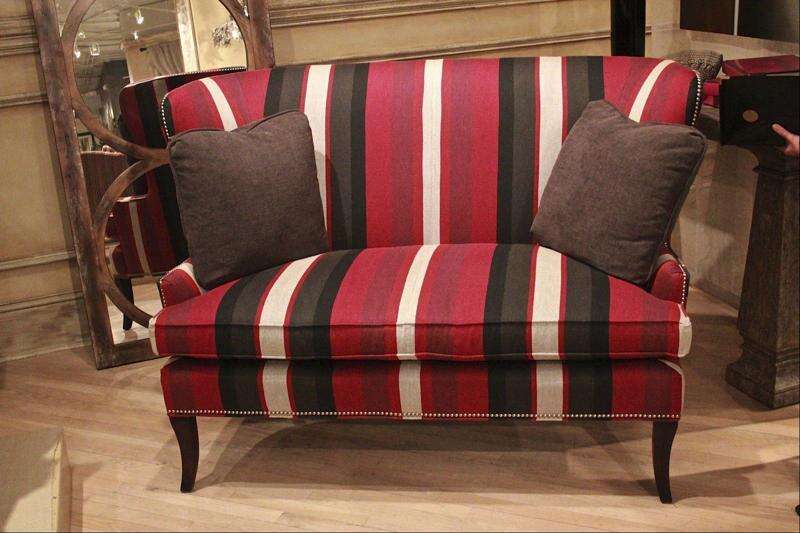Hooker Furniture used bold stripes of deep red and gray and nail trim for a handsome profile on its high-backed Sam Moore settee. So enamored with certain shades this market, Hooker featured scarlet painted wood frames on chairs as well as deep red bombé chests. Everything is coming up rose red.