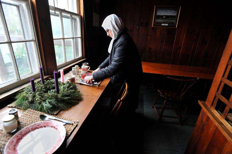Sister Angele Arbib moves a place setting inside the Abbey of Regina Laudis monastery in Bethlehem, Conn. Mother Dolores, a cloistered nun whose luminous blue eyes entranced Elvis Presley in his first on-screen movie kiss, is praying for a Christmas miracle. She walked away from Hollywood stardom in 1963 to become a nun in rural Bethlehem. Now she finds herself back in the spotlight, but this time it’s all about serving the King of Kings, not smooching the King of Rock and Roll. The former brass factory that houses Mother Dolores and about 40 other nuns cloistered at the Abbey of Regina Laudis needs millions of dollars in renovations to meet fire and safety codes, add an elevator and make handicap accessibility upgrades. (AP Photo/Jessica Hill) Associated Press