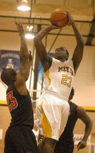 Isaac Bronaugh of Eisenhower tries to blcok a shot from Lashawn Cargo of Metea Valley at the Hinsdale South tournament Tuesday.