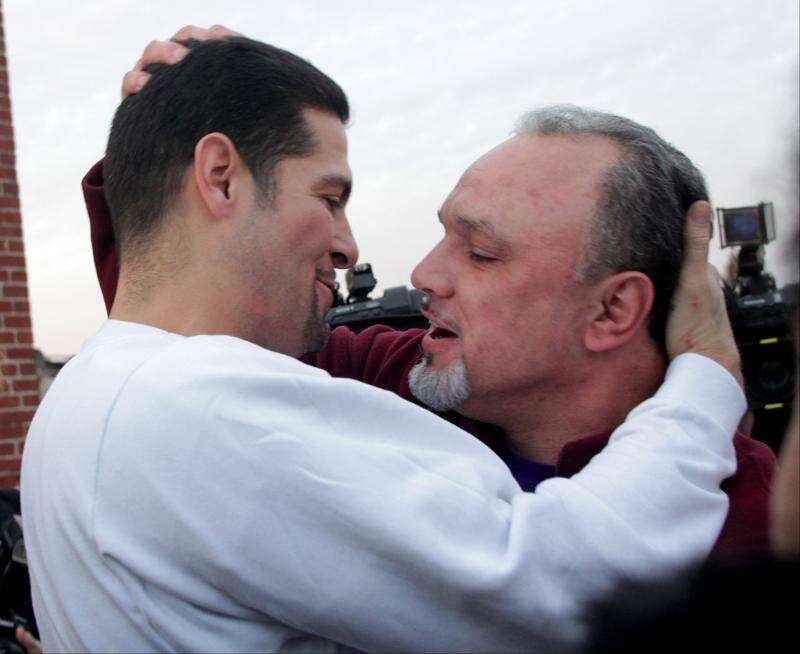 Juan Rivera, left, gets an emotional hug from Jacques Rivera, right, after Juan’s release from prison. Bev Horne/bhorne@dailyherald.com