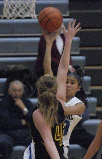 Burlington Central's Brenda Thasavong shoots past Richmond-Burton's Alex Callanan in the first quarter on Saturday, January 14.