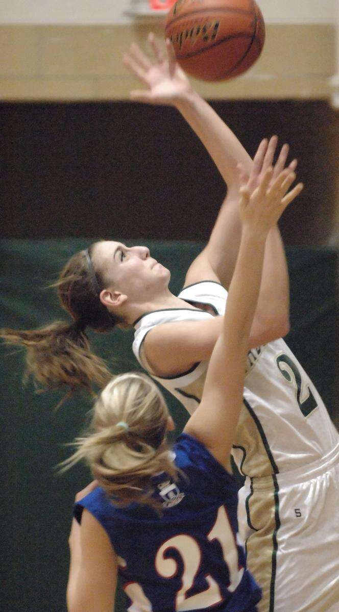 St. Edwards Rena Ranallo floats a shot for two points as Hinckley-Big Rocks Jacqueline Madden defends.