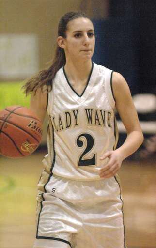 St. Edward's Rena Ranallo takes a behind-the-back pass from teammate Madeline Kerr as Hinckley-Big Rock's Lauren Paver defends.