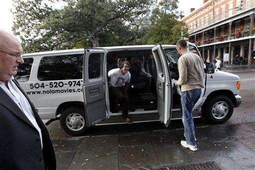 Jonathan Ray, co-owner of New Orleans Movie Tours, opens the doors for the tour participants at the end of a movie tour in New Orleans. The tour also includes peeks at the New Orleans homes of Brad Pitt, Sandra Bullock and John Goodman. Associated Press
