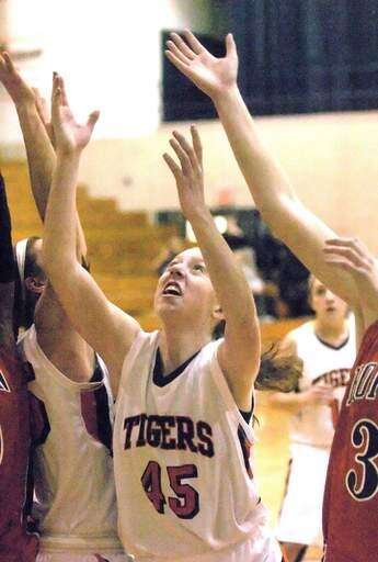 Melinda Franke of Wheaton Warrenville South and Rebecca Stoczynski of Hoffman Estates go up fo a rebound .