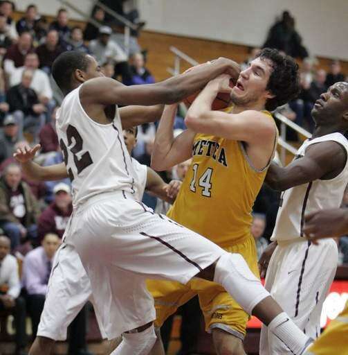 Metea Valley's Milan Bojanic battles Elgin's Cortez Scott and Kory Brown for control of a rebound. Brian Hill | Staff Photographer