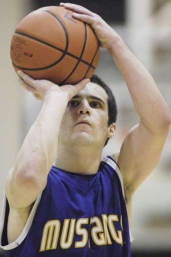 Rolling Meadows' Tyler Gaedele gets pumped after hitting a three-point shot.