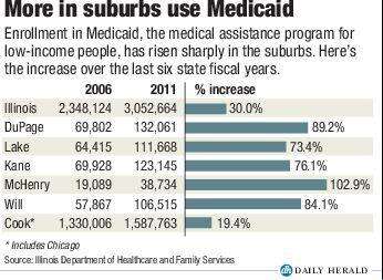 Medicaid enrollment since 2006 jumped 103 percent in McHenry County, 89 percent in DuPage County, 84 percent in Will County, 76 percent in Kane County and 73 percent in Lake County. Cook County Medicaid enrollment, including suburban Cook County, grew 19 percent.