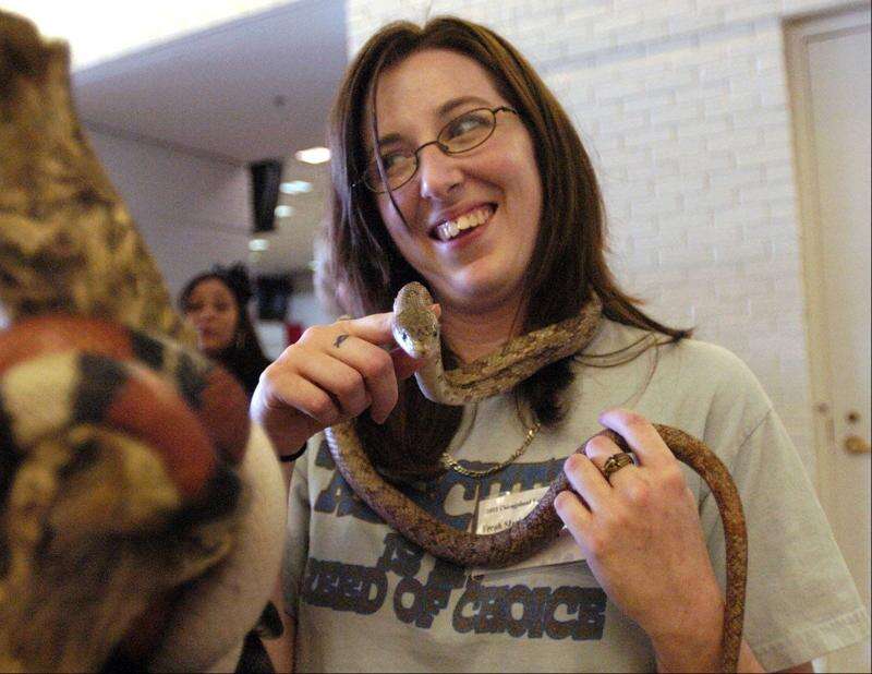 Amanda Cunefare of Paw Paw plays with Earl, a gray rat snake, Friday at the Chicagoland Family Pet Expo. Bob Chwedyk/bchwedyk@dailyherald.com