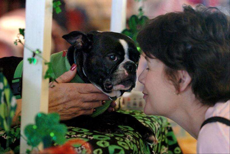 Lisa Berglund of Homer Glen tries to get a kiss from a Boston terrier named Gino in a Kiss Me IÂ’m Irish booth set up by Midwest Boston Terrier Rescue at the Chicagoland Family Pet Expo at Arlington Park. Bob Chwedyk/bchwedyk@dailyherald.com