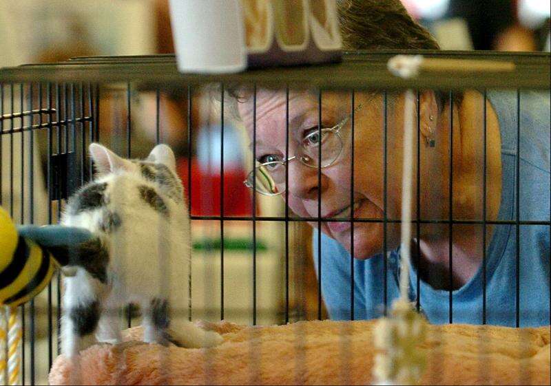 Kitty Stahl of Libertyville gets a closer look at another kitty at the Chicagoland Family Pet Expo at Arlington Park. Bob Chwedyk/bchwedyk@dailyherald.com
