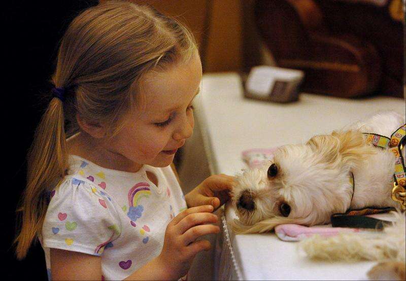 Four-year-old Delanie Wiezorek of Des Plaines pets Tessa, a Maltese, at the Chicagoland Family Pet Expo. Bob Chwedyk/bchwedyk@dailyherald.com