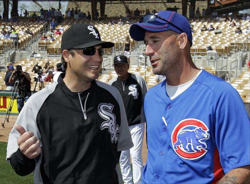 New White Sox manager Robin Ventura, left, compares notes with new Cubs manager Dale Sveum in spring training. Associated Press