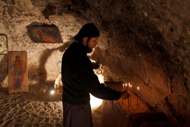 Associated PressA Greek Orthodox monk lights a candle inside a cave in a Temptation monastery, outside Jericho, West Bank.