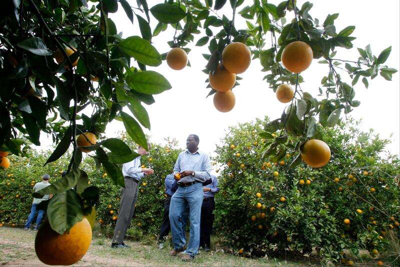 File - In this Jan. 24, 2012 file photo, Mamoudou Setamou, center, a citrus entomologist for the Texas A&M University Kingsville Citrus Center in Weslaco, walks through the grove where citrus greening disease has been found in San Juan, Texas. The California Department of Food and Agriculture announced Friday that citrus greening, also known as huanglongbing, has been discovered in lemon/pummelo tree in a residential neighborhood of Los Angeles County. The bacterial disease is carried by the Asian citrus psyllid and attacks the vascular system of trees. Associated Press