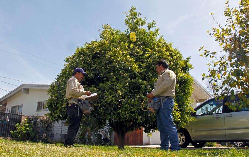 California Department of Food and Agriculture agricultural technicians Hector Verduzco, right, and Rafael Rodriguez inspect a small kumquat tree, where the first infestation of the Asian citrus psyllid (Diaphorina citri) was found in the front yard of a home in the Los Angeles suburb of Hacienda Heights, Calif., Monday, April 2, 2012. Several nearby citrus trees have already been infested. The insect, just discovered in California, is the carrier of a citrus disease that has killed millions of citrus trees and cost growers billions of dollars across Florida and Brazil. Associated Press