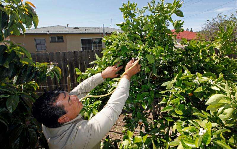 California Department of Food and Agriculture agricultural technician Hector Verduzco uses a vacuum tube to recover insect samples from a citrus tree infested with the Asian citrus psyllid (Diaphorina citri), from the backyard of a home in the Los Angeles suburb of Hacienda Heights, Calif., Monday, April 2, 2012. This yard had several heavily-infested citrus trees, and is just two homes away from the first infested tree found. The insect, just discovered in California, is the carrier of a citrus disease that has killed millions of citrus trees and cost growers billions of dollars across Florida and Brazil. Associated Press