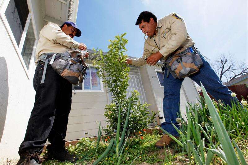 California Department of Food and Agriculture agricultural technicians Hector Verduzco, right, and Rafael Rodriguez inspect a tree, which has a trap at top that has collected a large variety of insects, at a home next door to the first tree found to be infested with the Asian citrus psyllid (Diaphorina citri), in the front yard of a home in the Los Angeles suburb of Hacienda Heights, Calif. Associated Press