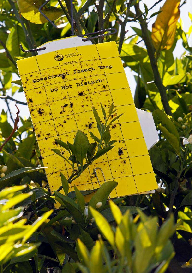 This trap placed in a tree has collected a large variety of insects at a home next door to the first tree found to be infested with the Asian citrus psyllid (Diaphorina citri), in the front yard of a home in the Los Angeles suburb of Hacienda Heights, Calif., Monday, April 2, 2012. The insect, just discovered in California, is the carrier of a citrus disease that has killed millions of citrus trees and cost growers billions of dollars across Florida and Brazil. Associated Press