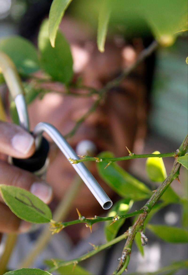 California Department of Food and Agriculture agricultural technician Hector Verduzco uses a suction device to recover insect samples from a citrus tree infested with the Asian citrus psyllid (Diaphorina citri), in the backyard of a home in the Los Angeles suburb of Hacienda Heights, Calif., Monday, April 2, 2012. This tree is one of several heavily-infested citrus trees in this yard just two homes away from the first infested tree found. The insect, just discovered in California, is the carrier of a citrus disease that has killed millions of citrus trees and cost growers billions of dollars across Florida and Brazil. Associated Press