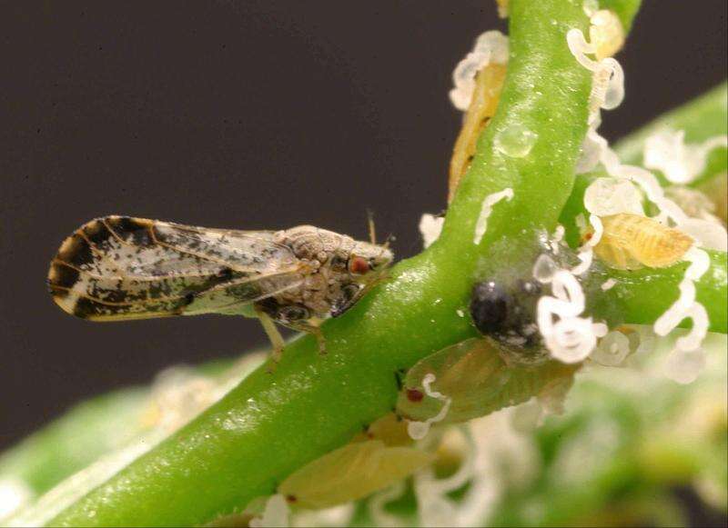 In this undated file photo, the Asian citrus psyllid is seen in this University of Florida photo provided by the University of California, Davis. The California Department of Food and Agriculture announced Friday that citrus greening, also known as huanglongbing, has been discovered in lemon/pummelo tree in a residential neighborhood of Los Angeles County. The bacterial disease is carried by the Asian citrus psyllid and attacks the vascular system of trees. Associated Press