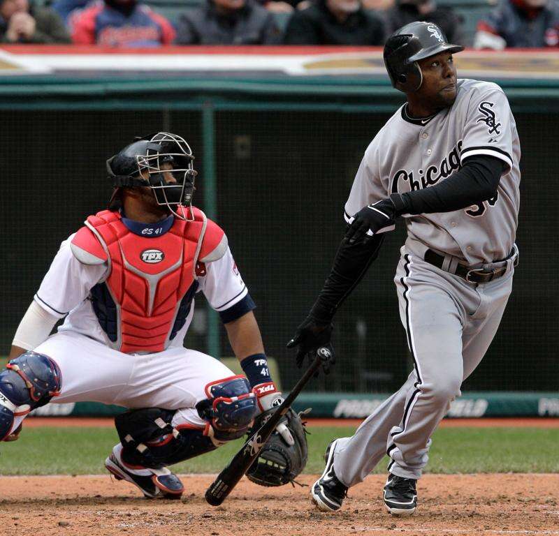 Alejandro De Aza watches the flight of his 2-run home run in the sixth inning off Indians relief pitcher Dan Wheeler during the White SoxÂ’ victory Wednesday in Cleveland. Associated Press