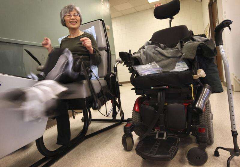 Susan Fink was told she would never walk again after a cross-country skiing accident 12 years ago. Today, the 61-year-old walks with a walker around her home, but uses a power wheelchair everywhere else. Three times a week, she rides an exercise bicycle at Sister Kenny, using electrical stimulation to coax her leg muscles to move and pedal.