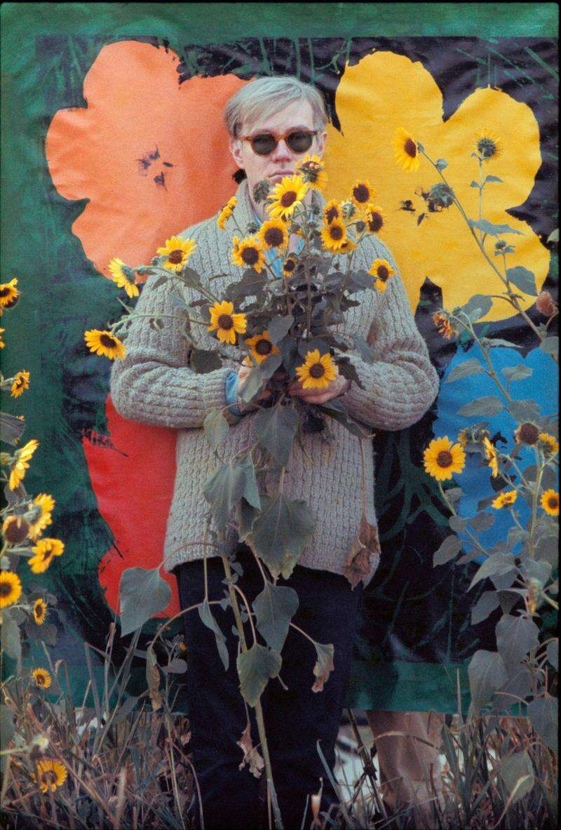 In another image, the photographer posed Warhol with one of his early flower paintings standing in a field of black-eyed Susans, located in a most unlikely spot — an industrial section of the Flushing neighborhood in New York City’s Queens borough.