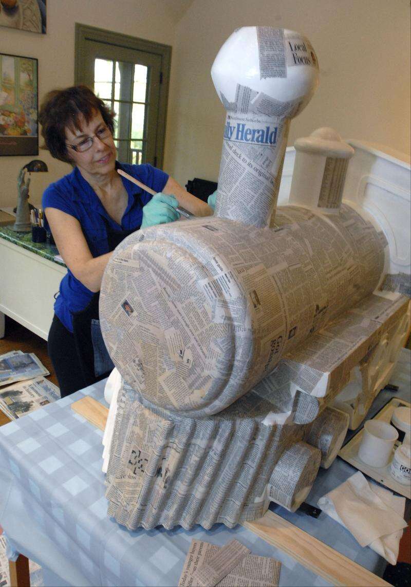 Marcie Paddock, a member of Paddock Publications board of directors, is decoupaging small pieces of old Daily Heralds to form a backdrop on “The Engine of Democracy.”