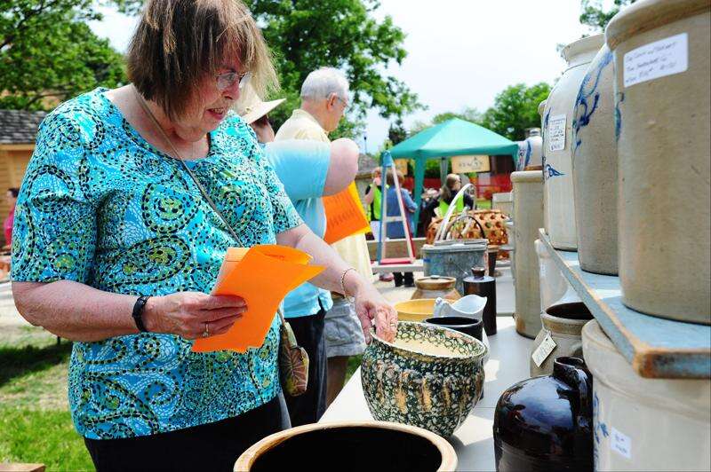 Sue Mancini examines the pottery on display during the Antiques on the Green sale held Saturday by the Glen Ellyn Historical Society at Stacy’s Tavern Museum. John McGillen/jmcgillen@dailyherald.com