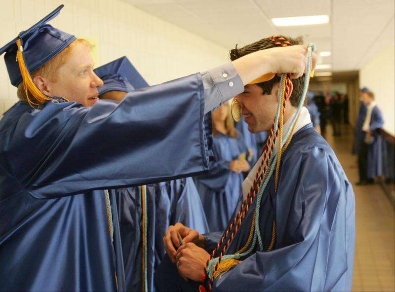 Kevin Salat, left, helps Cody Schulz, right, before the 2012 Wheaton North High School graduation, held at College of DuPage in Glen Ellyn. There were 507 Wheaton North graduates.